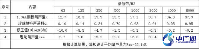 據上述計算,隔音板理論平均隔聲量不低于 22. 1dB ,滿足設計要求。
