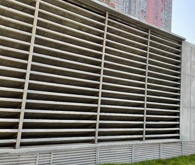 3、進氣消聲。空調外機進氣也是降噪的重點之一。由于空調機組設備較大,排氣量與進氣量都是非常巨大的,但是空調設備的壓縮機產生的噪聲值也是非常的高,既要保證降噪效果又要保證進氣,所以使用進氣斜插式消聲百葉和進氣企口。